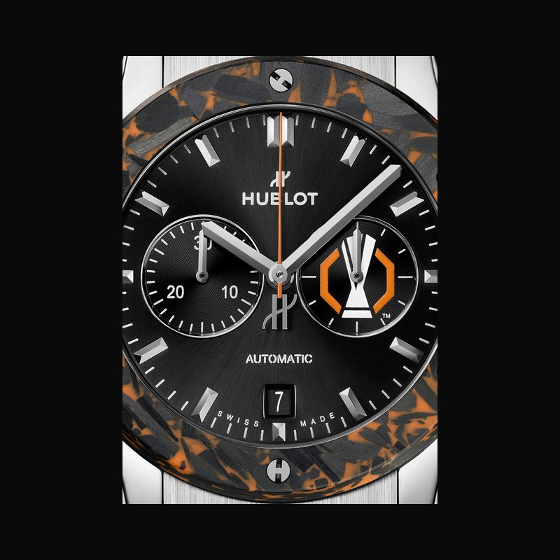 La pièce reprend fidèlement les codes de la Ligue Europa de l’UEFA, à savoir le noir et l'orange. Ils sont visibles sur la lunette très technique développée par Hublot pour ce modèle : de la fibre de carbone, oscillant entre noir et gris anthracite, incrustée de fibres de verre orange, ponctuée des 6 vis emblématiques Hublot en forme de « H » en titane. L’assemblage des fibres de carbone et de verre se fait de manière aléatoire, faisant de chacun des 50 exemplaires une pièce véritablement unique.