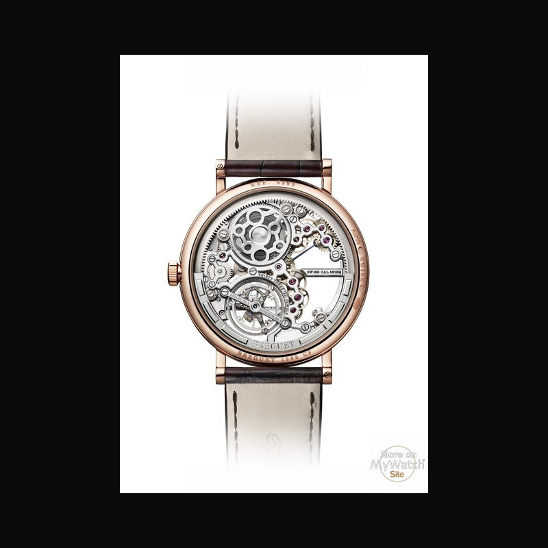 | Plus de caractéristiques : | Mouvement « Squelette » mécanique à remontage automatique Anglé, Gravé et guilloché à la main Numéroté et signé Breguet Cal. 581SQ extra-plat (3 mm) 325 composants 16 lignes 33 rubis Réserve de marche de 80 heures Barillet sur galets à roulement à billes Fréquence 4 Hz Spiral plat en silicium Petite seconde sur l’axe du tourbillon Boitier Or rose 18 carats à carrure finement cannelée Cadran Saphir Signé Breguet Tour d’heures excentré à chiffres romains Bracelet / Boucles Alligator avec boucle déployante en or |