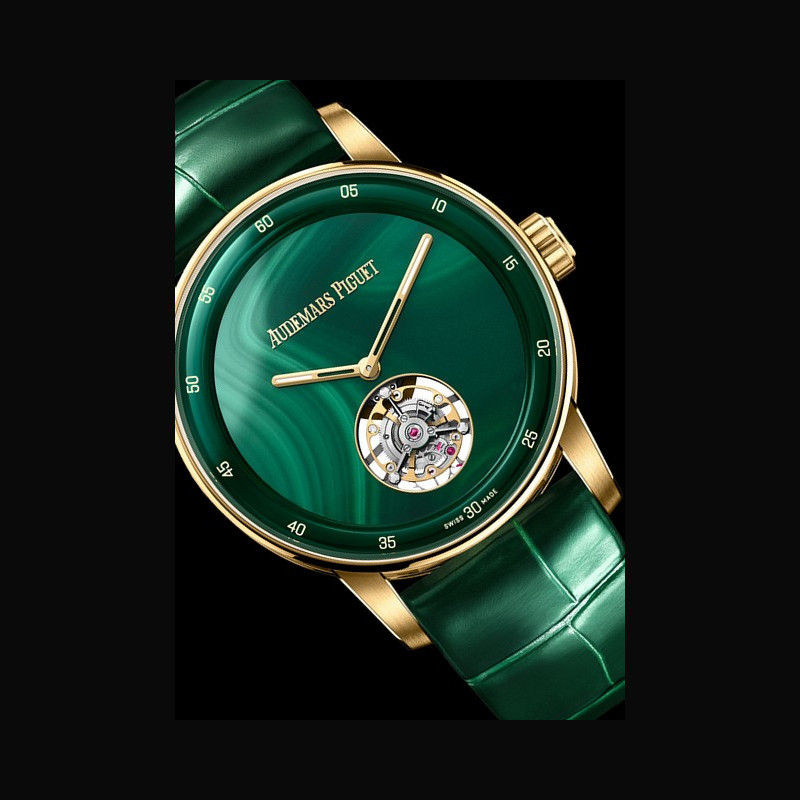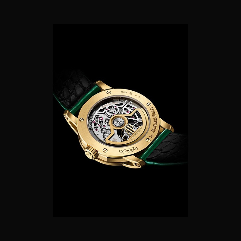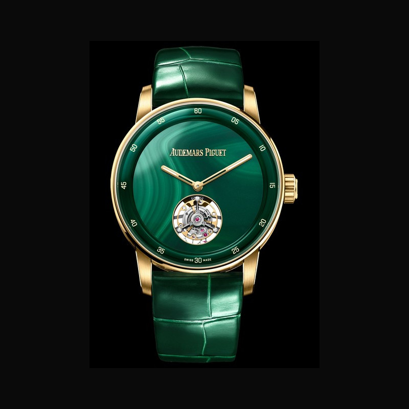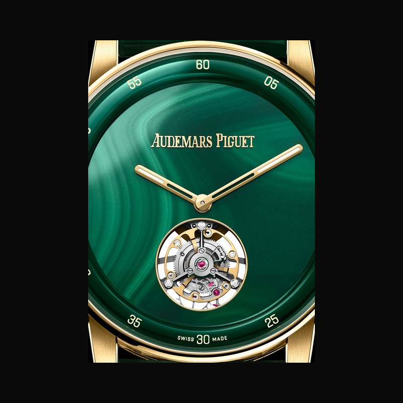 Audemars Piguet commence à explorer le potentiel esthétique des cadrans en pierre naturelle dans les années 1960. Exigeant un savoir-faire exceptionnel, chaque cadran est réalisé à partir d'une fine couche de pierre, minutieusement taillée et polie pour préserver son intégrité tout en révélant son éclat naturel. Les variations de tons, les veinures et la richesse de texture inhérentes à chaque pierre sont le gage qu’aucun cadran n’est identique. Au-delà de leur rareté et de leur beauté physique, les pierres précieuses sont depuis longtemps porteuses de significations symboliques, en résonance avec les multiples dimensions de l’expérience humaine. On leur attribue également des propriétés énergétiques uniques : elles auraient des bienfaits sur l'équilibre émotionnel, le bien-être et l’assurance. Pour ce trio exclusif, Audemars Piguet a soigneusement sélectionné des pierres précieuses du monde entier : la racine de rubis de Tanzanie, associée à la vitalité et à la protection ; la sodalite bleue du Brésil, symbolisant le calme et la clarté ; et la malachite verte de Zambie, réputée pour favoriser la croissance et la transformation. Pour beaucoup, ces matériaux sont plus que décoratifs : ils ont une portée émotionnelle, faisant de chaque montre à la fois un talisman et une merveille mécanique.