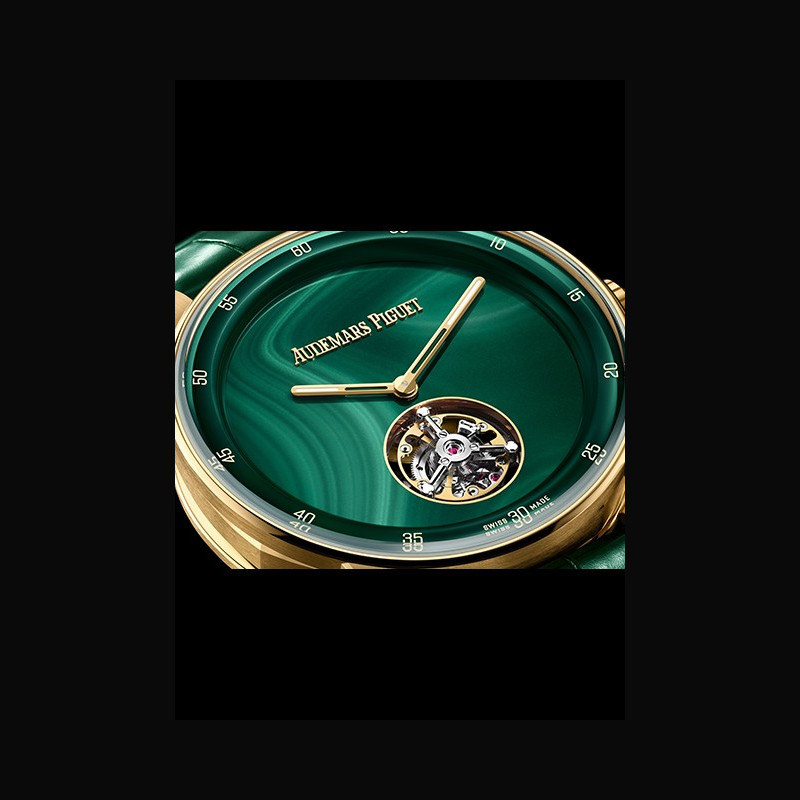 Au cœur de ces nouvelles créations bat le Calibre 2968, le mouvement à tourbillon volant automatique de la Manufacture, spécialement conçu pour les montres de moins de 41 mm. Introduit en 2022 sur la Royal Oak RD#3 (d'abord en 39 mm, puis en 37 mm), ce calibre extra-plat a fait ses débuts cette année dans la collection Code 11.59 by Audemars Piguet en 38 mm. D'une épaisseur de seulement 3,4 mm, cette complication de haut vol a été repensée et redessinée pour en réduire la largeur, tout en conservant les proportions initiales de la cage. Pour la première fois, la cage du tourbillon en titane est équipée d'un entraînement périphérique afin de gagner en légèreté, tandis qu'un échappement à grande amplitude permet d’améliorer la fiabilité, la distribution d'énergie et la précision. Contrairement à un tourbillon traditionnel, la cage du tourbillon volant n’est tenue que par le bas, ce qui lui confère une allure gracieuse, en lévitation au-dessus du fond en pierre naturelle du cadran. Fruit d’une expertise de plusieurs générations, la Code 11.59 by Audemars Piguet Tourbillon Volant Automatique de 38 mm établit une nouvelle norme en matière de miniaturisation, démontrant que savoirfaire technique et élégance ergonomique ne sont pas incompatibles, mais représentent au contraire deux facettes d’une même vision. Avec son architecture raffinée, la boîte de 38 mm incarne à la fois la maîtrise technique et l’intention artistique, offrant une expérience horlogère puissante dans un format aux proportions harmonieuses.