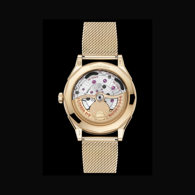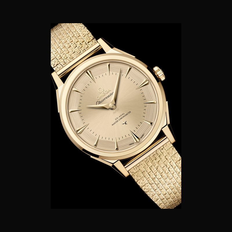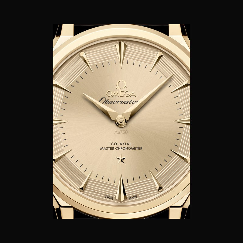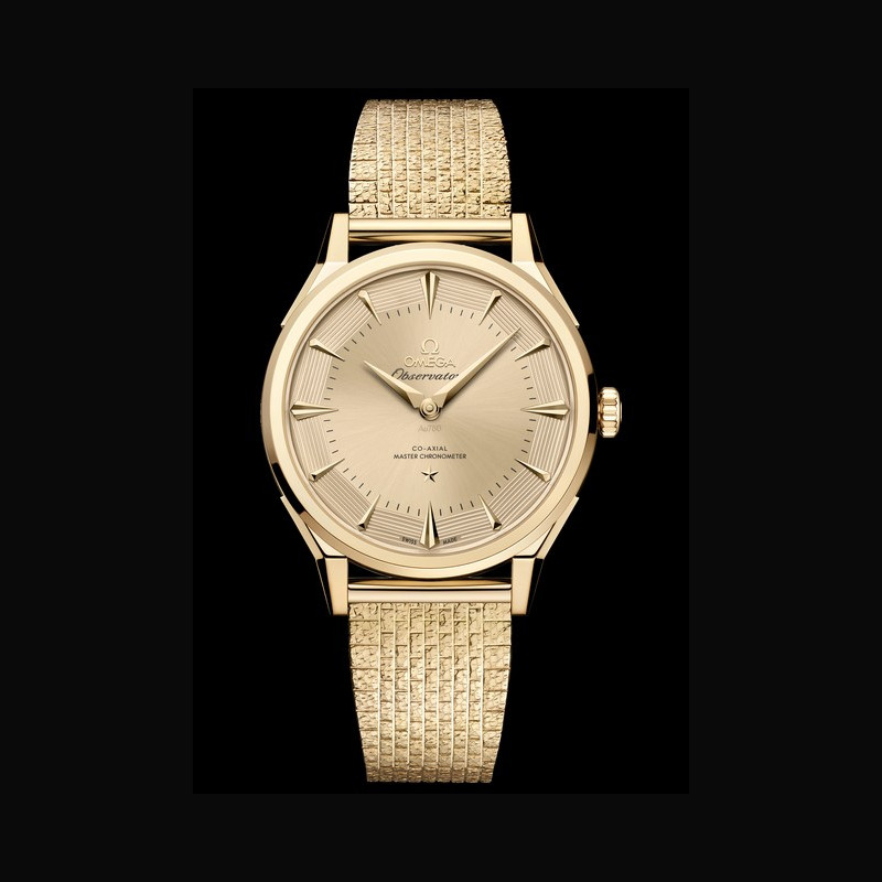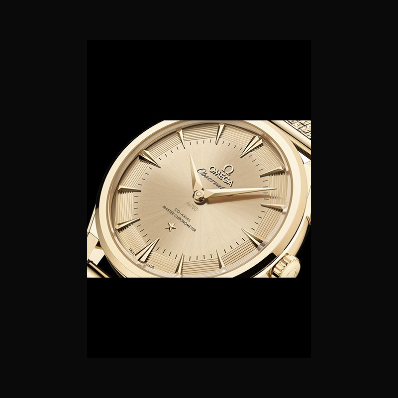 La collection OMEGA Constellation Observatory réinterprète les codes esthétiques emblématiques de la marque. Le design de la Centenary de 1948, qui a posé les bases de la Constellation. Le cadran pie-pan dodécagonal, introduit peu après, avec l’étoile Constellation à 6 heures et le médaillon Observatory au fond du boîtier. La finition guillochée des facettes du cadran pie-pan, apparue avec les versions Grand Luxe. Les index horaires facettés en forme de cerf-volant et les aiguilles dauphine des Constellation antérieures, réinterprétés. Les cornes dog- leg caractéristiques des modèles OMEGA de l’époque. Le motif « briques » à neuf rangées d’un bracelet en maille or Moonshine™ 18K, inspiré des bracelets de la même période.