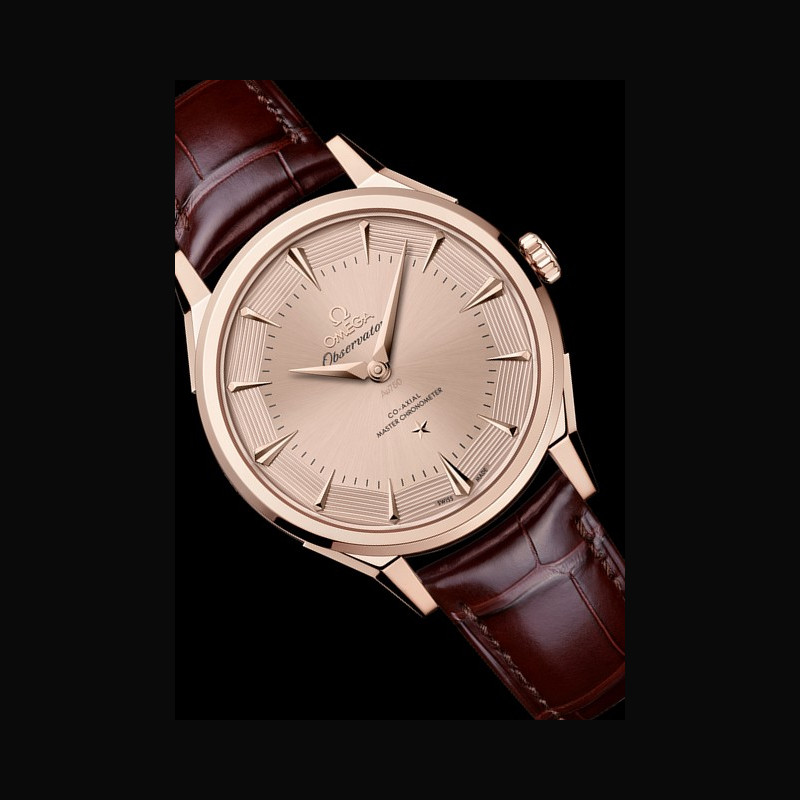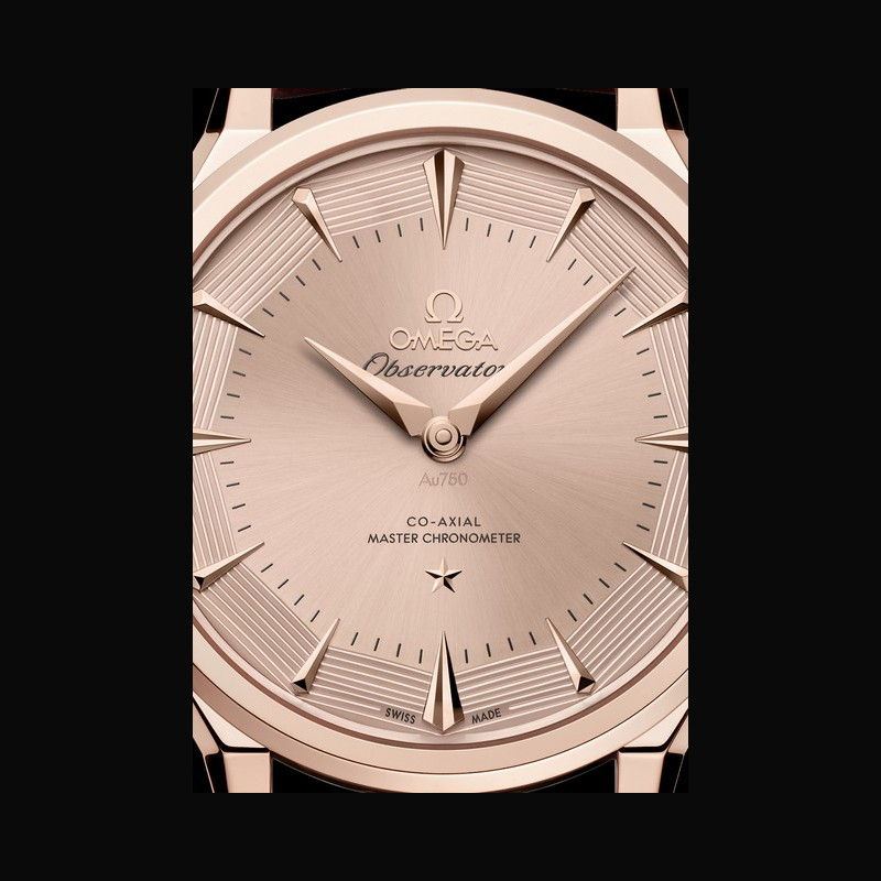 La collection OMEGA Constellation Observatory réinterprète les codes esthétiques emblématiques de la marque. Le design de la Centenary de 1948, qui a posé les bases de la Constellation. Le cadran pie-pan dodécagonal, introduit peu après, avec l’étoile Constellation à 6 heures et le médaillon Observatory au fond du boîtier. La finition guillochée des facettes du cadran pie-pan, apparue avec les versions Grand Luxe. Les index horaires facettés en forme de cerf-volant et les aiguilles dauphine des Constellation antérieures, réinterprétés. Les cornes dog- leg caractéristiques des modèles OMEGA de l’époque. Le motif « briques » à neuf rangées d’un bracelet en maille or Moonshine™ 18K, inspiré des bracelets de la même période.