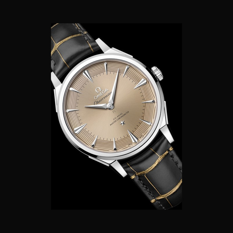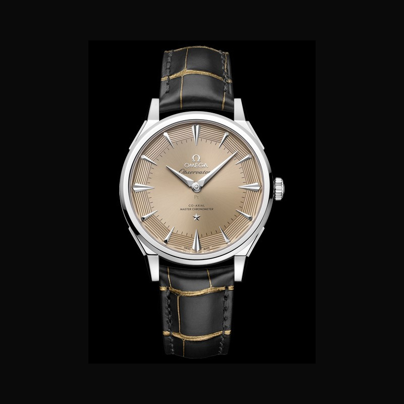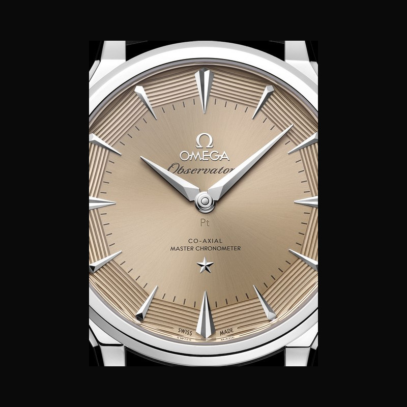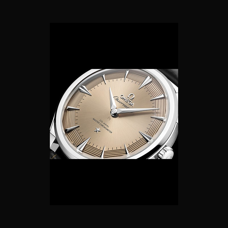 La collection OMEGA Constellation Observatory réinterprète les codes esthétiques emblématiques de la marque. Le design de la Centenary de 1948, qui a posé les bases de la Constellation. Le cadran pie-pan dodécagonal, introduit peu après, avec l’étoile Constellation à 6 heures et le médaillon Observatory au fond du boîtier. La finition guillochée des facettes du cadran pie-pan, apparue avec les versions Grand Luxe. Les index horaires facettés en forme de cerf-volant et les aiguilles dauphine des Constellation antérieures, réinterprétés. Les cornes dog- leg caractéristiques des modèles OMEGA de l’époque. Le motif « briques » à neuf rangées d’un bracelet en maille or Moonshine™ 18K, inspiré des bracelets de la même période.