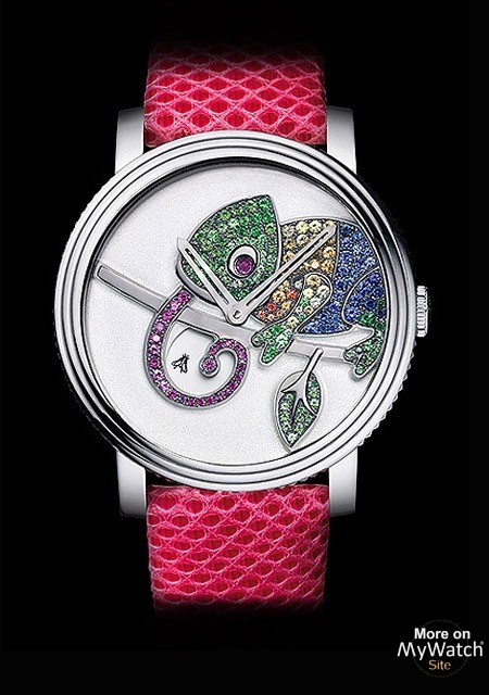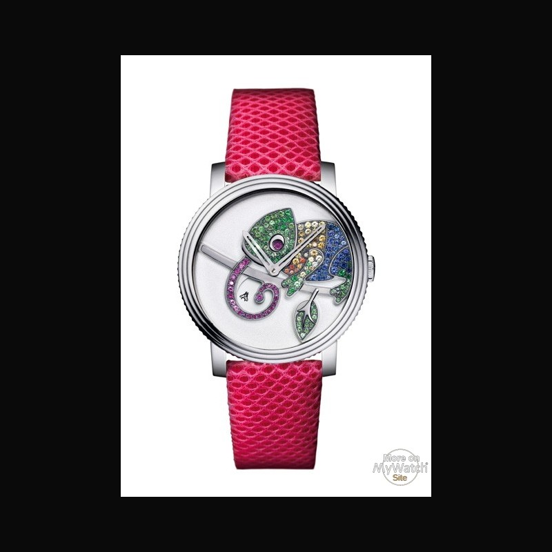 | Plus de caractéristiques : | Fonctions Heures. minutes. secondes décentrées à 7 heures avec indicateur de fonctionnement rotatif simulant un insecte virevoltant dans la spirale formée par la langue de l’animal Cadran Caméléon serti de 173 pierres précieuses (1.30 carats) 27 rubis (0.16 carat) 72 saphirs multicolores (0.64 carat) 74 tsavorites (0.50 carat) Boîtier en or gris 18 carats Fond avec glace saphir en forme d'ellipse Boucle ardillon en or gris avec motif 'Pointe de Diamant' Poids d'or : 87.90 g |