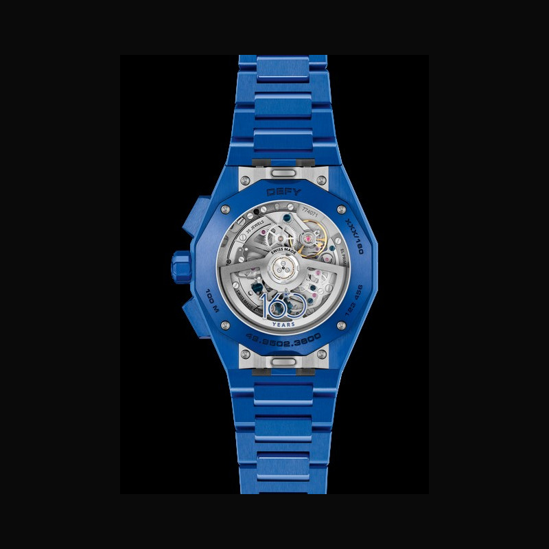 Pensée pour s’adapter à toutes les situations, la DEFY Skyline Chronograph – Édition 160e Anniversaire est équipée d’un système de changement rapide de bracelet, intégré directement au boîtier. D’une simple pression, le bracelet en céramique à trois maillons peut être remplacé par le bracelet en caoutchouc bleu à motif étoilé fourni avec la montre, le tout sécurisé par une boucle déployante en acier.