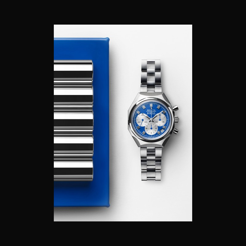 Le boîtier en acier de 37,3 mm conserve les lignes fortes de l’originale, avec une lunette à 14 pans et des poussoirs type "pompe" qui renforcent son allure vintage. Elle est montée sur le célèbre bracelet “ladder” créé en 1969 par la manufacture Gay Frères pour ZENITH. Étanche à 10 ATM, elle associe robustesse et sophistication. Le cadran, structuré par des index carrés aux rainures horizontales, affirme une identité architecturale forte. Il est décliné en quatre coloris emblématiques de l’univers USM : Vert USM, Orange Pur, Jaune Doré et Bleu Gentiane. Chaque teinte rend hommage à la palette modulaire du système Haller. Les trois compteurs de chronographe, en finition argentée cerclée, apportent relief et profondeur. Leur motif azuré rappelle subtilement la poignée USM.