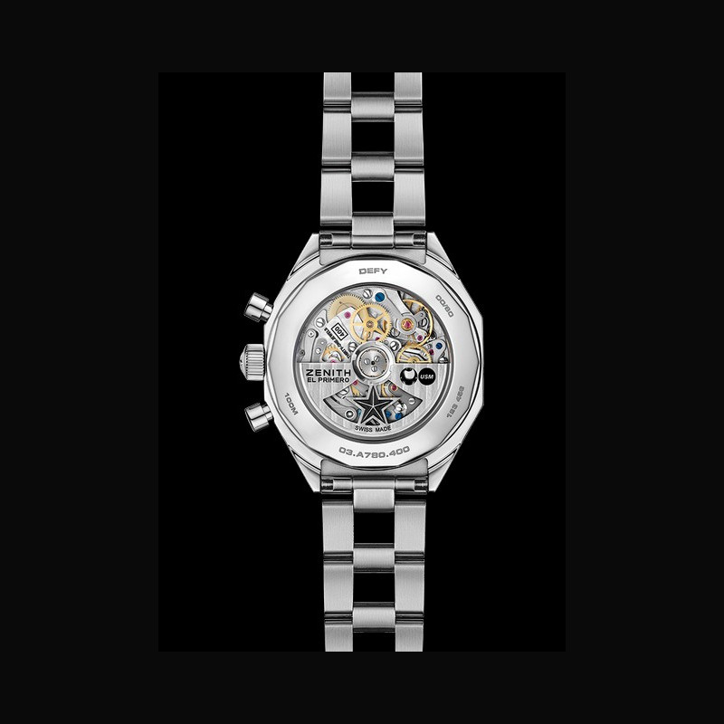 À l’intérieur, on retrouve le célèbre calibre El Primero 400, descendant direct du tout premier chronographe automatique haute fréquence dévoilé par ZENITH en 1969. Encore aujourd’hui, ce mouvement reste une référence absolue : fréquence de 5 Hz, remontage automatique, roue à colonnes, affichage des heures, minutes, petite seconde, fonctions chronographe et date à 4 h 30. Visible à travers le fond en saphir, la masse oscillante est décorée d’une étoile ajourée, accompagnée des logos ZENITH El Primero et USM. Une signature élégante qui illustre l’union parfaite entre horlogerie et design industriel.