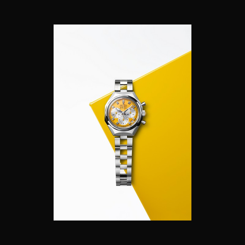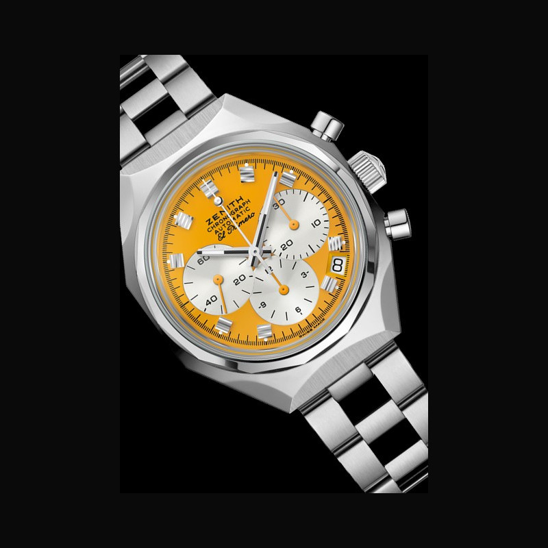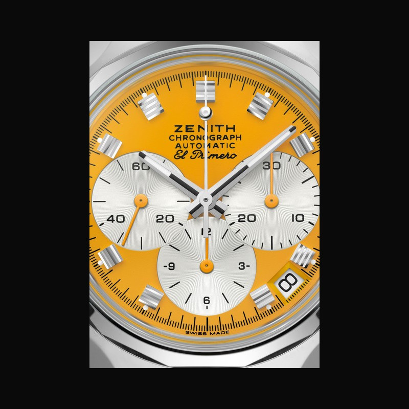 Le boîtier en acier de 37,3 mm conserve les lignes fortes de l’originale, avec une lunette à 14 pans et des poussoirs type "pompe" qui renforcent son allure vintage. Elle est montée sur le célèbre bracelet “ladder” créé en 1969 par la manufacture Gay Frères pour ZENITH. Étanche à 10 ATM, elle associe robustesse et sophistication. Le cadran, structuré par des index carrés aux rainures horizontales, affirme une identité architecturale forte. Il est décliné en quatre coloris emblématiques de l’univers USM : Vert USM, Orange Pur, Jaune Doré et Bleu Gentiane. Chaque teinte rend hommage à la palette modulaire du système Haller. Les trois compteurs de chronographe, en finition argentée cerclée, apportent relief et profondeur. Leur motif azuré rappelle subtilement la poignée USM.