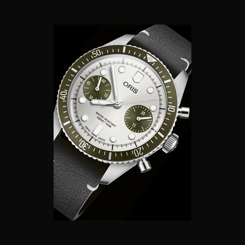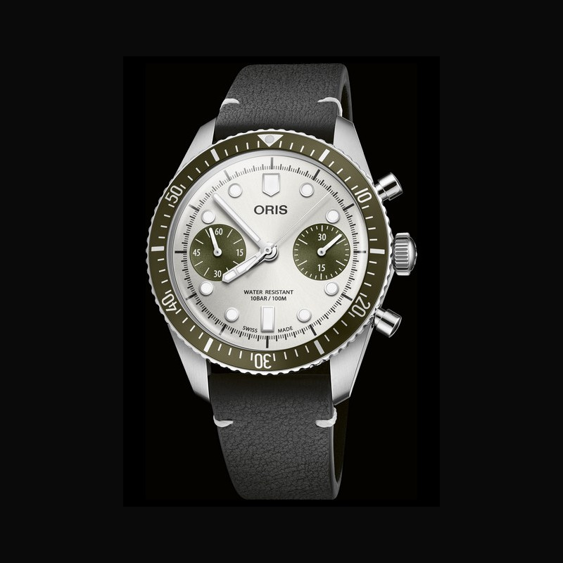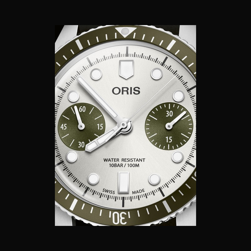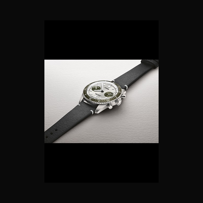 Nous sommes ravis de vous présenter notre nouveau chronographe Divers Sixty-Five vert-océan. Ce modèle conserve le même design néo-vintage qui fait écho à l'esprit de notre première montre de plongée de 1965 depuis que nous lui avons insufflé une nouvelle vie il y a plus d'une décennie. Remarquez les poussoirs de chronographe vintages, les chiffres condensés et l'index en forme de bouclier à 12 heures. Ce nouveau modèle de 40,00 mm poursuit l'histoire avec un mélange élégant et apaisant de cadran gris argenté soleillé et de détails verts sur le cadran et la lunette. Les couleurs sont inspirées de la nature, en particulier le vert profond de l'océan, une nuance qui reprend également les tons vert chêne des collines boisées qui entourent notre manufacture de Hölstein. Derrière la façade rétro de la montre se cache un mouvement chronographe mécanique contemporain, le calibre Oris 771. Outre les indications de la petite seconde et du compteur 30 minutes du chronographe, il offre une réserve de marche de 62 heures. Étanche à 10 bars (100 mètres), la montre est livrée sur un bracelet en cuir de cerf Cervo Volante issu de l'agriculture durable ou sur un bracelet en acier inoxydable.