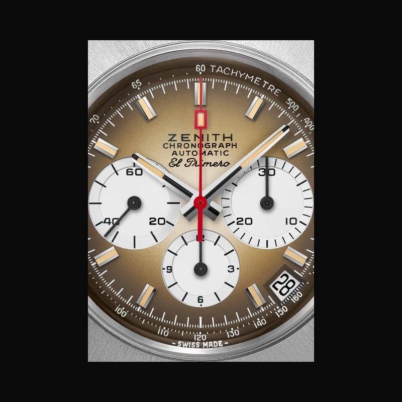 Ce qui faisait vraiment ressortir l’A385 du lot, c’était son cadran fumé au dégradé brun avec un effet vignette qui noircit vers les bords et donne une impression de profondeur visuelle, comme si le cadran était bombé. Pour cette pièce Chronomaster Revival, Zenith a cherché à recréer les mêmes tons chauds et l'effet dégradé, presque impossible à distinguer de l'original avec son aiguille de chronographe centrale rouge et les compteurs chronographe blancs.