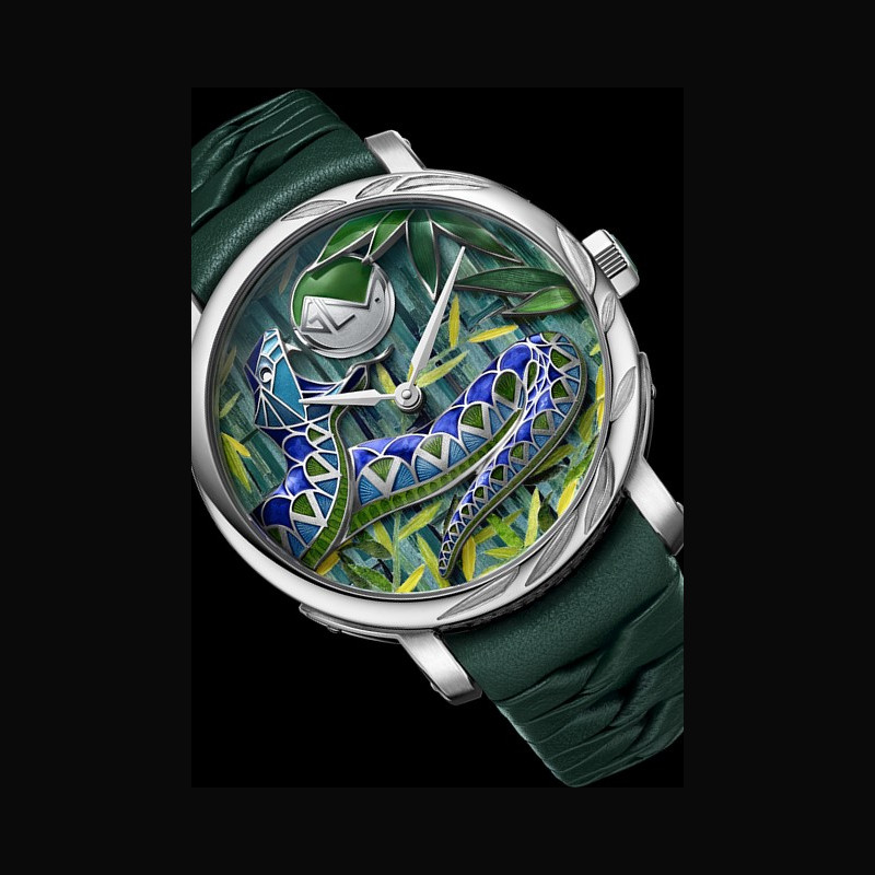 La montre Koi’s Garden est proposée avec un boîtier en or blanc de 40 mm et un bracelet bleu. La version Snake’s Jungle dispose, quant à elle, d’un boîtier en or jaune de 40 mm et d’un bracelet vert, tandis que le modèle Dragon’s Cloud présente un boîtier en or rose de 40 mm et un bracelet marron.