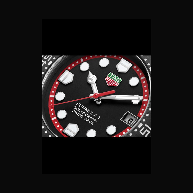 Affichage : | Rehaut rouge avec échelle 60 secondes/minute Index appliqués et polis en plaqué rhodium avec technologie Super-LumiNova® blanche en journée et luminescence verte la nuit Aiguilles des heures et des minutes polies en plaqué rhodium avec technologie Super-LumiNova® blanche en journée et luminescence verte la nuit Aiguille centrale laquée rouge Logo TAG HEUER vert rouge et blanc imprimé Date à 3 heures Inscriptions FORMULA 1 SOLARGRAPH et SWISS MADE imprimées |
