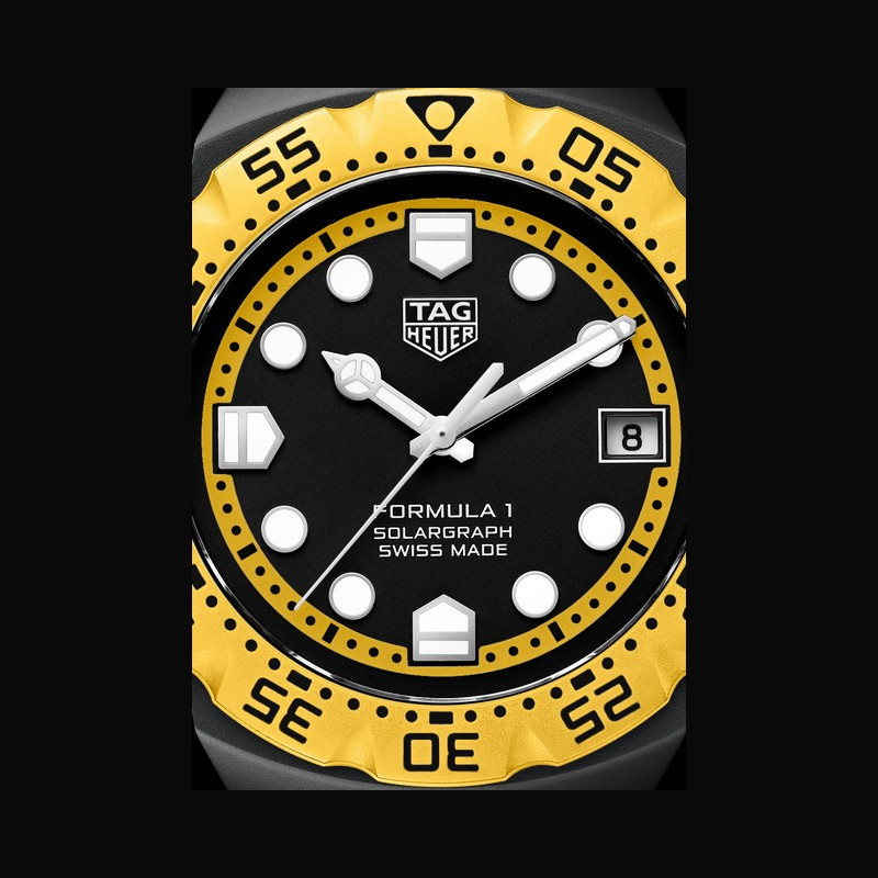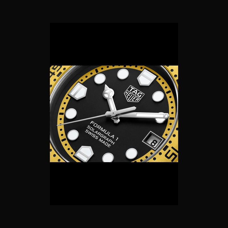 Affichage : | Rehaut jaune avec échelle 60 secondes/minute Index appliqués et polis en plaqué rhodium avec technologie Super-LumiNova® blanche en journée et luminescence verte la nuit Aiguilles des heures et des minutes polies en plaqué rhodium avec technologie Super-LumiNova® blanche en journée et luminescence verte la nuit Aiguille centrale polie en plaqué rhodium Logo TAG HEUER blanc imprimé Date à 3 heures Inscriptions FORMULA 1 SOLARGRAPH et SWISS MADE imprimées |