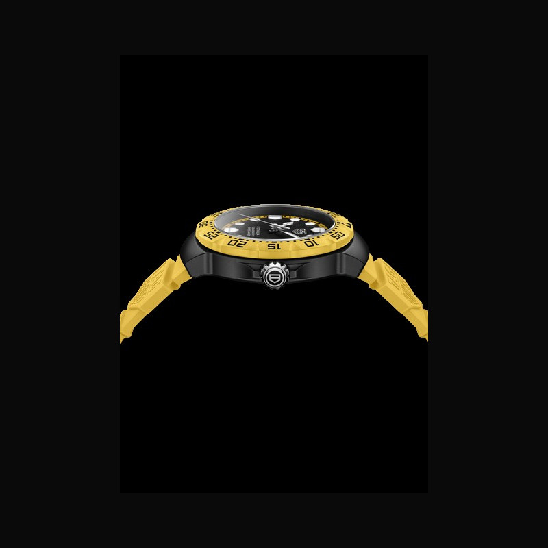 Particularité du boitier : | Lunette rotative bidirectionnelle 60 secondes/minute en bio-polyamide jaune Couronne en acier à 3 heures Fond vissé en acier avec revêtement DLC noir |