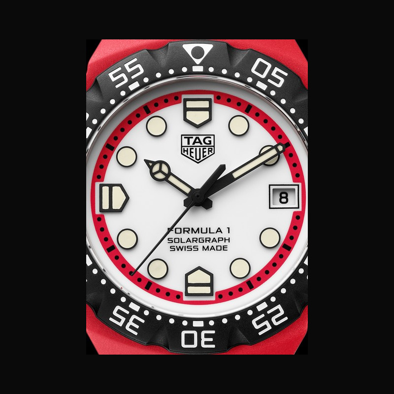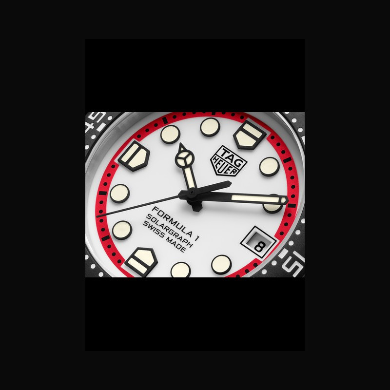 Affichage : | Rehaut rouge avec échelle 60 secondes/minute Index laqués noirs avec technologie Super-LumiNova® coquille d’œuf en journée et luminescence verte la nuit Aiguilles des heures et des minutes polies et laquées noires avec technologie Super-LumiNova® coquille d’œuf en journée et luminescence verte la nuit Aiguille centrale laquée noire Logo TAG HEUER noir imprimé Date à 3 heures Inscriptions FORMULA 1 SOLARGRAPH et SWISS MADE imprimées |