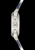 L’élégance du boîtier en platine poli, avec lunette concave et flancs creusés et satinés, est rehaussée par un bracelet en alligator bleu nuit brillant équipé d’une boucle déployante en platine.