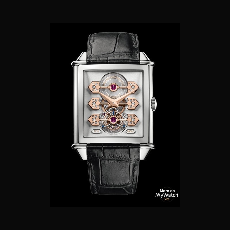 | Plus de caractéristiques : | Mouvement Girard-Perregaux GP09600-0028 Dimensions: 30.30 x 28.60 mm (121/2 ‘’’ x 131/4’’’) Fréquence: 21'600 Alt/h – (3Hz) Réserve de marche: min. 48 heures Rubis: 31 Nombre de composants: 249 Platine: guillochée Ponts: Trois Ponts d’Or de type bercés. forme flèche. anglés et polis Balancier: à inertie variable Spiral: courbe terminale Phillips Tourbillon: 80 composants d’un poids total de 0.3 grammes Une rotation par minute Cages supérieure et inférieure anglées et polies main Pont d’échappement et pont d’ancre anglés et polis main Fonctions : Tourbillon. heure. minute. petite seconde sur le Tourbillon Boîtier en or gris Couronne: or gris avec logo GP gravé Fond: satiné vertical et gravé du logo commémoratif de l’anniversaire. fermé par 4 vis Bracelet en alligator noir cousu main Boucle déployante en or gris |