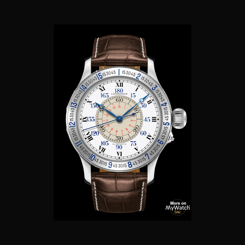 Pas moins de 47 millimètres et demi de diamètre ! Ce modèle, avec sa taille d’origine, est inspiré du brevet d’une montre déposée en liaison avec Longines par le commandant P.V.H. Weems - une invention simple et décisive, permettant de synchroniser la montre à la seconde près avec le signal horaire radio, au moyen de la lunette extérieure du cadran central. Au début du siècle dernier, de telles dimensions facilitaient sa lecture et sa manipulation dans la pénombre et les vibrations des avions de l’époque. De même, sa grande couronne moletée offrait une prise sûre aux doigts gantés du pilote ou du navigateur.