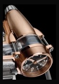 | Particularité du boitier : | Nacelle de gauche avec cadran pour l'indication de la réserve de marche 2 nacelles en forme de réacteurs d'avion Chaque cadran est contrôlé par sa propre couronne Nacelle de droite avec cadran pour la lecture des heures et des minutes |