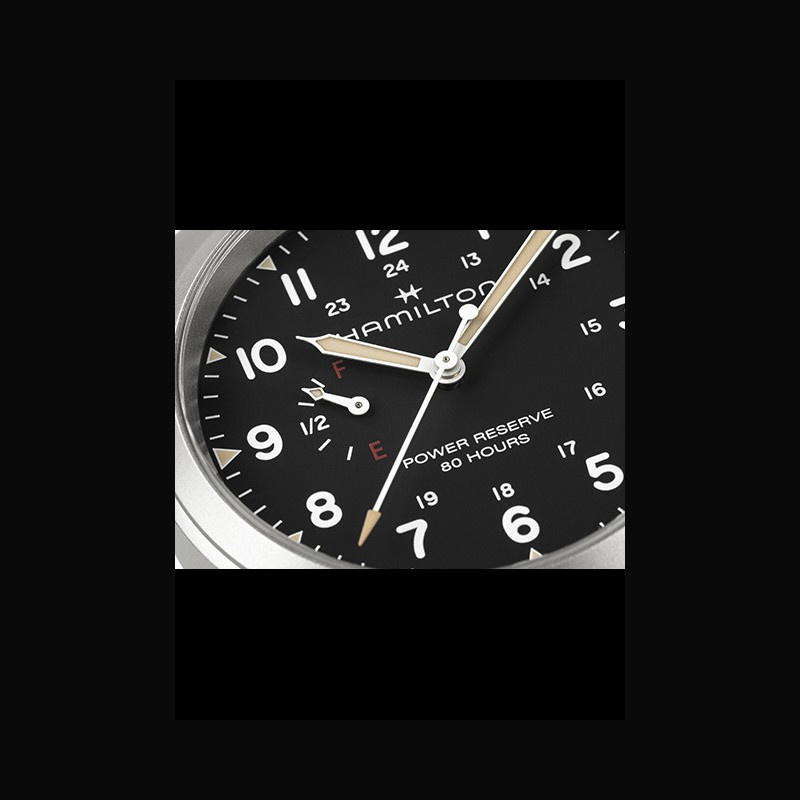 Inspirée des montres mécaniques classiques des soldats, la Khaki Field Power Reserve Mechanical conserve la palette de couleurs signature, le design et l’esthétique brute de la collection. Les aiguilles sont revêtues de Super-LumiNova® couleur radium vintage pour un aspect vintage authentique, tandis que l’indicateur de réserve de marche à 9 heures est accentué par un rouge caractéristique, indiquant clairement « F » pour pleine et « E » pour vide. Le cadran affiche fièrement « réserve de marche 80 heures » pour mettre en valeur cette caractéristique exceptionnelle et utilitaire.