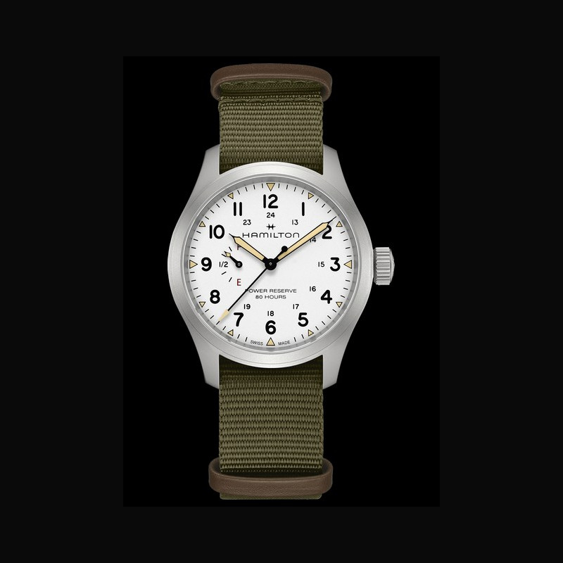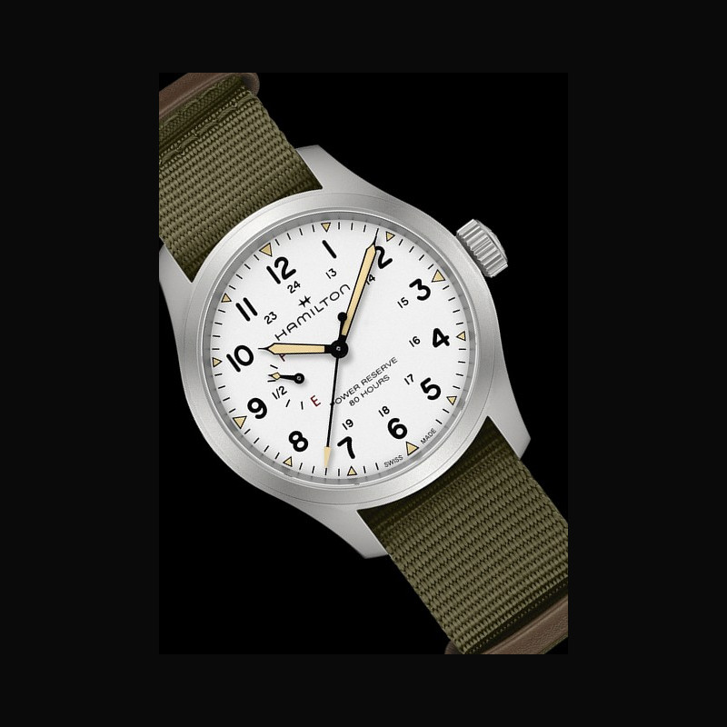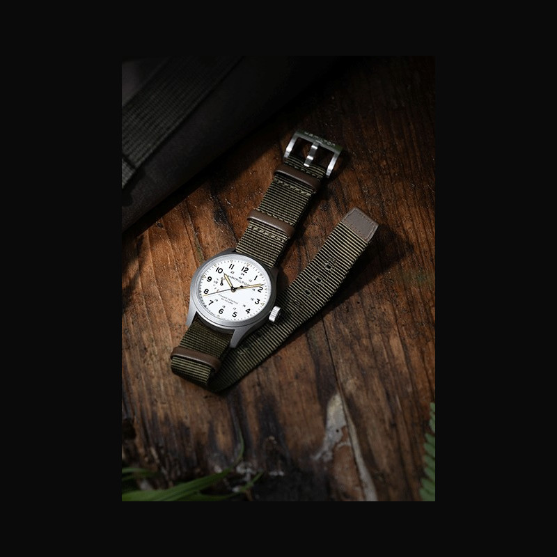 Bien que le boîtier conserve la forme Khaki Field emblématique, il a été soigneusement adapté pour accueillir le nouveau mouvement et arbore une finition sablée raffinée. Disponible avec un cadran classique noir ou blanc, chaque montre est livrée avec un bracelet à trois rangs en acier inoxydable avec fermoir papillon ou un bracelet NATO vert avec des passants en cuir marron. Le système EasyClick du bracelet métal permet de changer rapidement de bracelet lors de vos déplacements.