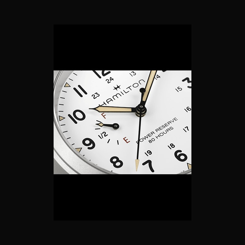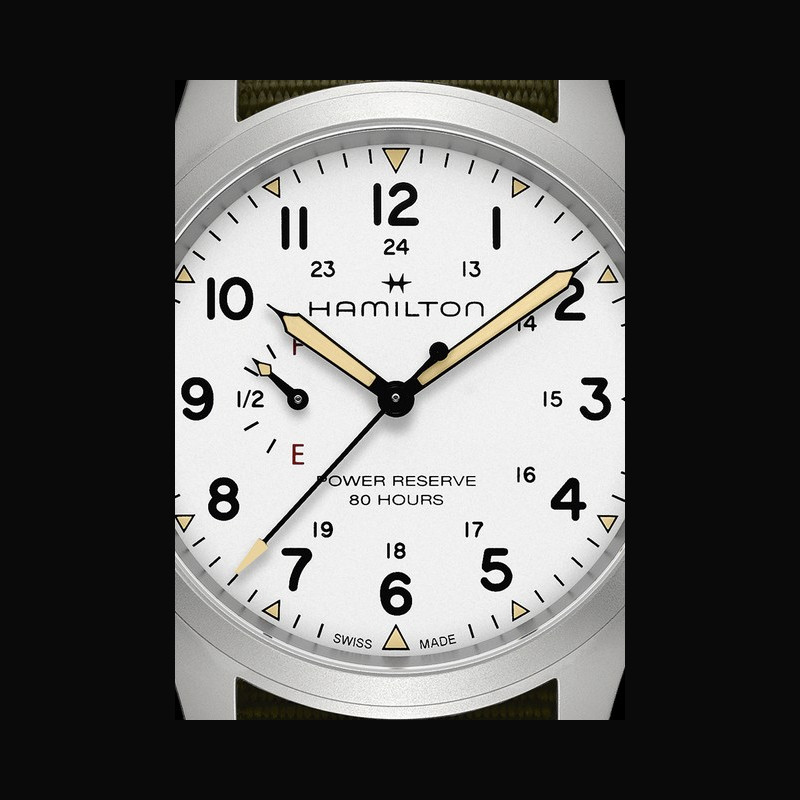 Inspirée des montres mécaniques classiques des soldats, la Khaki Field Power Reserve Mechanical conserve la palette de couleurs signature, le design et l’esthétique brute de la collection. Les aiguilles sont revêtues de Super-LumiNova® couleur radium vintage pour un aspect vintage authentique, tandis que l’indicateur de réserve de marche à 9 heures est accentué par un rouge caractéristique, indiquant clairement « F » pour pleine et « E » pour vide. Le cadran affiche fièrement « réserve de marche 80 heures » pour mettre en valeur cette caractéristique exceptionnelle et utilitaire.