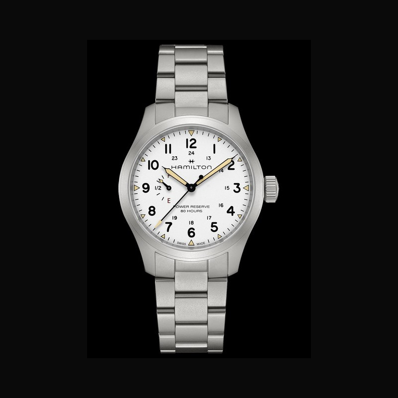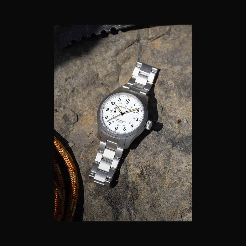 Bien que le boîtier conserve la forme Khaki Field emblématique, il a été soigneusement adapté pour accueillir le nouveau mouvement et arbore une finition sablée raffinée. Disponible avec un cadran classique noir ou blanc, chaque montre est livrée avec un bracelet à trois rangs en acier inoxydable avec fermoir papillon ou un bracelet NATO vert avec des passants en cuir marron. Le système EasyClick du bracelet métal permet de changer rapidement de bracelet lors de vos déplacements.