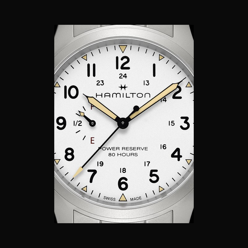 Inspirée des montres mécaniques classiques des soldats, la Khaki Field Power Reserve Mechanical conserve la palette de couleurs signature, le design et l’esthétique brute de la collection. Les aiguilles sont revêtues de Super-LumiNova® couleur radium vintage pour un aspect vintage authentique, tandis que l’indicateur de réserve de marche à 9 heures est accentué par un rouge caractéristique, indiquant clairement « F » pour pleine et « E » pour vide. Le cadran affiche fièrement « réserve de marche 80 heures » pour mettre en valeur cette caractéristique exceptionnelle et utilitaire.