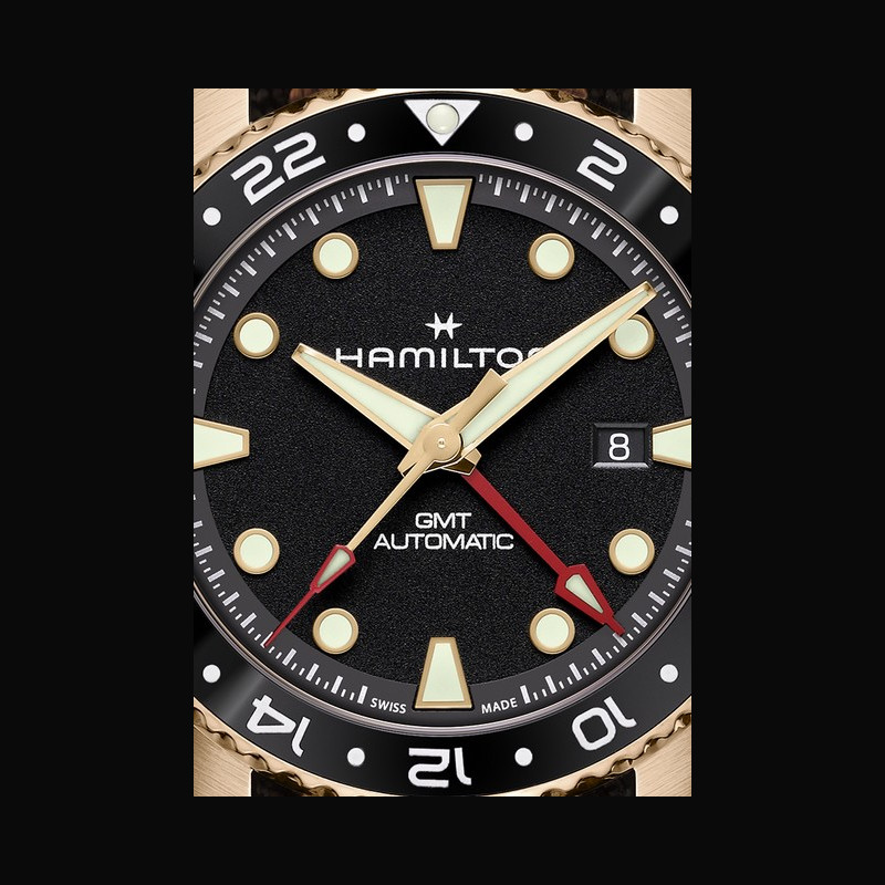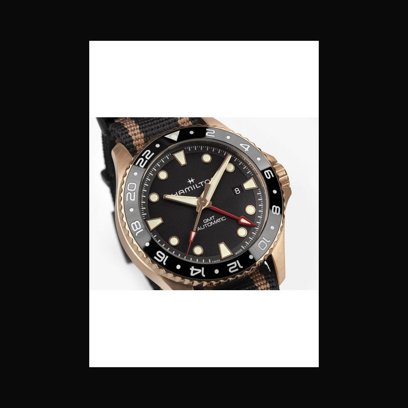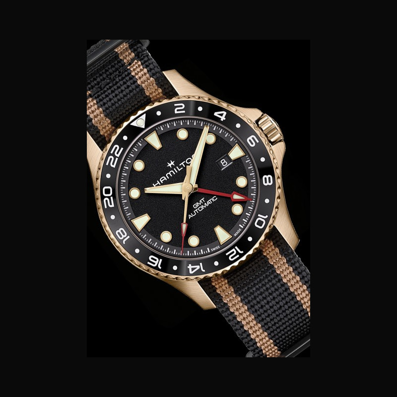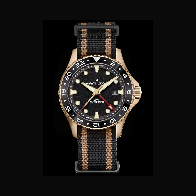 | Plus de caractéristiques : | Mouvement H-14 automatique avec balance en Nivachron™, 80h de réserve de marche et fonction GMT Boitier Bronze avec lunette céramique Cadran Noir graîné Bracelet / Boucles NATO noir avec rayures dorées, passants et boucle ardillon en PVD noir |