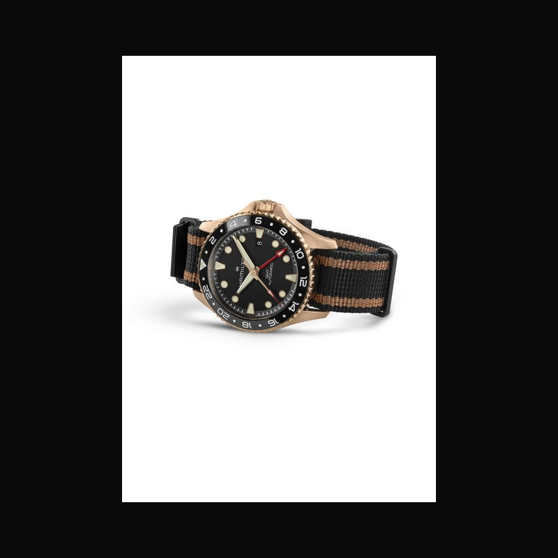 | + Plus de caractéristiques : | Mouvement H-14 automatique avec balance en Nivachron™, 80h de réserve de marche et fonction GMT Boitier Bronze avec lunette céramique Cadran Noir graîné Bracelet / Boucles NATO noir avec rayures dorées, passants et boucle ardillon en PVD noir |