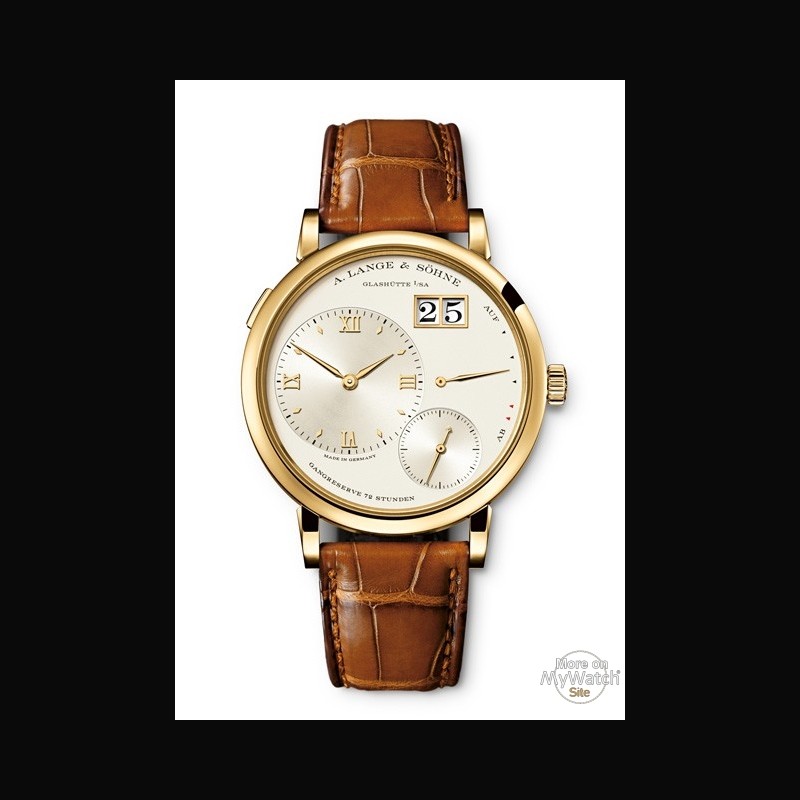 | + Plus de caractéristiques : | Mouvement Réglage de précision en cinq positions Platines et ponts en maillechort non traité Nombre de composants :397 Rubis : 42 Echappement à ancre Balancier à vis antichoc Spiral de balancier fabriqué par la manufacture 21 600 alt./heure Mise au repère haute précision avec vis de réglage latérale et ressort à col de cygne Réserve de marche : 72 h Bracelet : croco cousu main Boucle Lange en or jaune |