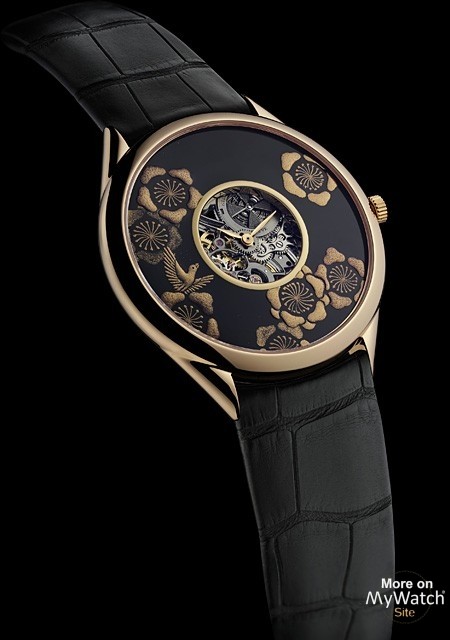 D’un point de vue horloger, c’est le légendaire calibre extra-plat 1003 qui a été choisi par Vacheron Constantin pour équiper cette série de garde-temps. C’est une version squelette du mouvement construit en or 14 carats que l’on retrouve ici. Toutefois, pour magnifier l’harmonie de l’ensemble et veiller à ce que le travail du maki-e soit bien mis en avant, Vacheron Constantin a été jusqu’à opter pour un traitement ruthénium qui – calmant l’éclat naturel de l’or - offre un effet des plus élégants à la montre. Les glaces saphir sur les deux faces permettent d’admirer les finitions exceptionnelles, notamment le travail d’anglage, réalisées dans les ateliers de la manufacture genevoise.