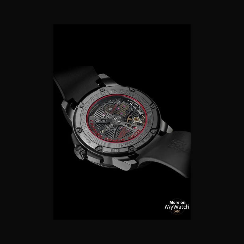 Intensément noire, la montre Mille Miglia GTS Automatic Speed black vient enrichir cette collection iconique en revisitant les caractéristiques des voitures classiques qui ont participé à la course italienne de 1940 à 1957.Revêtue de noirprofond sur son boîtier, son cadran et jusqu’à ses vis fonctionnelles, elle affiche une allure puissante et une présence sportive adaptées à toutes occasions.Ce garde-temps contemporain réalisé à 1'000 exemplaires se présente dans un robuste boîtier de 43 mm de diamètre en acier noirci par traitement DLC (Diamond-LikeCarbon), un revêtement extrêmement résistant, surmonté d’une lunette avec insert gradué en aluminium noir. Ses cornes courtes et profilées, étudiées pour épouser idéalementle poignet, offrent un confort optimal et un style unique, que complète le bracelet intégré en caoutchouc noir, inspiré des pneus Dunlop des années 1960 et refermé par une boucle déployante en acier DLC. Le fond vissé, pour une étanchéité garantie à 100 mètres, est fixé par huit vis noires traitées PVD et gravé de l’inscription « Mille Miglia GTS Speed black ». Sa glace teintée,ceinte d’un joint rouge vif, révèle en transparence le mouvement Chopard, ses finitions moteurs et sa masse oscillante ajourée.