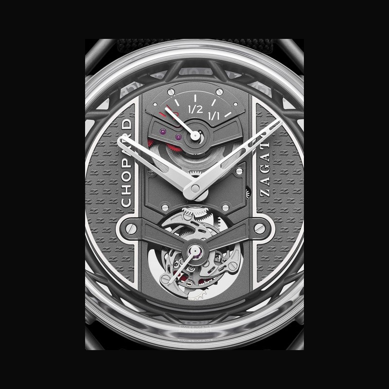 | Affichage : | Platine en titane céramisé couleur anthracite décorée de motifs ‘Z’ de Zagato en relief positif ; de logos Chopard et Zagato rhodiés et polis ; et de chanfreins rhodiés et polis Aiguilles des heures et de minutes rhodiées ; type squelette ; de forme évoquant les volants de course aux bras percés Aiguilles rhodiées ; type bâton ; pour la petite seconde et l’indicateur de réserve de marche Indicateur de réserve de marche en forme de jauge de carburant Pont de tourbillon en titane céramisé de forme évoquant les bras d’un volant de course |