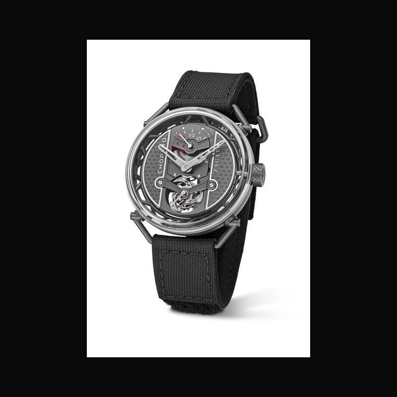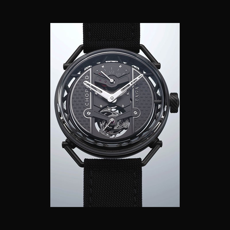 Les anses libres, au design tubulaire, permettent la tenue optimale de la montre au poignet. A la place des cornes, elles adoptent une fonctionnalité pivotante dont l’amplitude est contrôlée par un système de réglage (environ 45 degrés de chaque côté). Sur le flanc, la couronne est inspirée des engrenages de différentiels automobiles et personnalisée d’un volant gravé – devenu emblématique des codes Classic Racing de Chopard. L’affichage de l’heure fait l’objet d’une recherche esthétique alliant contemporanéité et lisibilité : la platine du mouvement faisant office de cadran est décorée d’une répétition du motif ‘Z’ emblématique de Zagato, avec des chanfreins mis en valeur par un traitement rhodié. Les logos Chopard et Zagato, également rhodiés, s’affichent en relief positif. L’ensemble est surmonté d’une glassbox ajustée à fleur de la bande de carrure, favorisant la lisibilité du cadran. Par souci de symétrie, la glace de fond adopte un principe similaire pour prolonger la carrure et offrir une vue intégrale sur le mouvement, sublimant chaque détail mécanique.