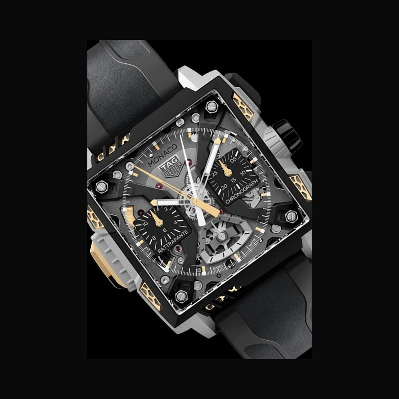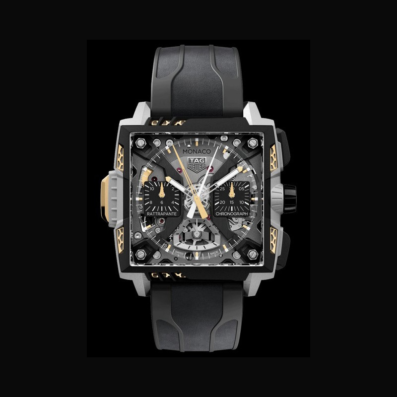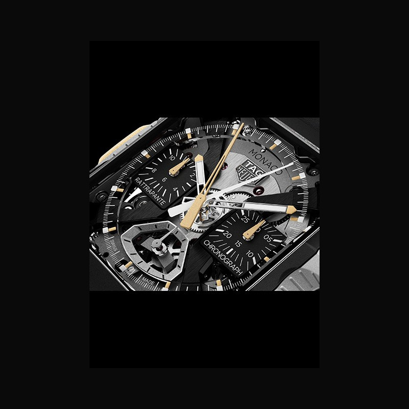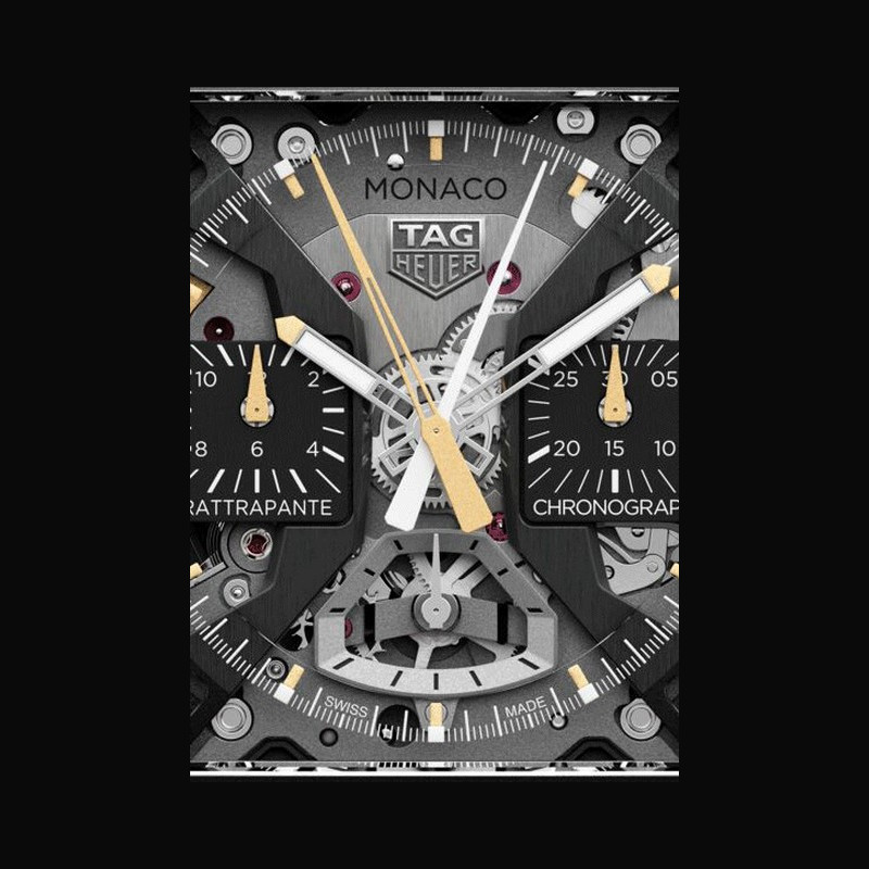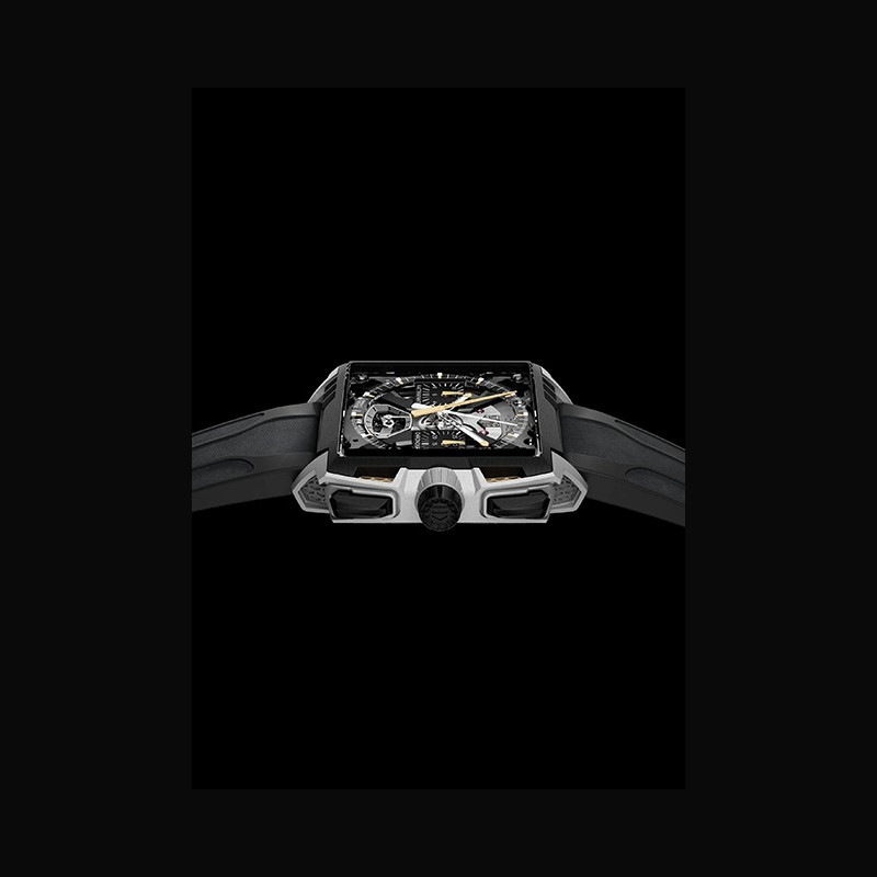Afin de compléter son style high-tech, la montre présente un cadran en verre saphir qui laisse apercevoir la mécanique du mouvement, des poussoirs de chronographe, une couronne fuselée en titane grade 5 à revêtement DLC noir, des aiguilles de chronographes dorées, des aiguilles des heures et des minutes à extrémité dorée, des index dorés, ainsi qu’un avant et un fond en verre saphir, maintenus en place par quatre vis apparentes. Le poussoir à rattrapante à 9 heures est en or jaune massif 2N, un clin d’œil à la couronne à gauche de la TAG Heuer Monaco originelle. La montre est complétée d’un bracelet en caoutchouc noir, rehaussé d’empiècements en alcantara et d’une boucle en titane grade 5 à revêtement DLC noir.