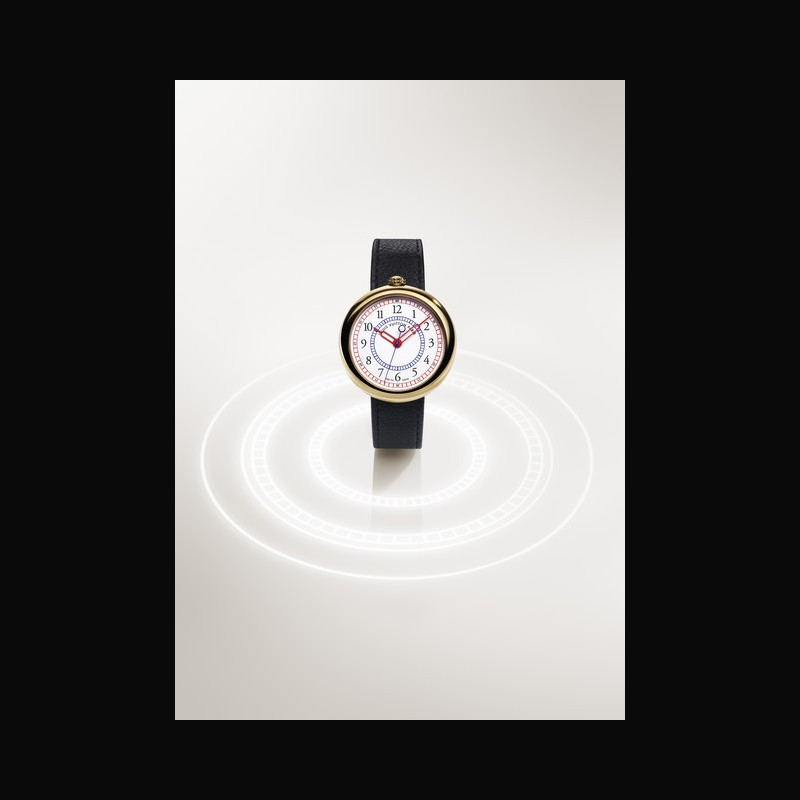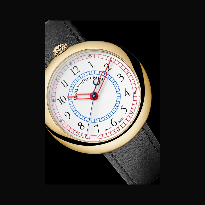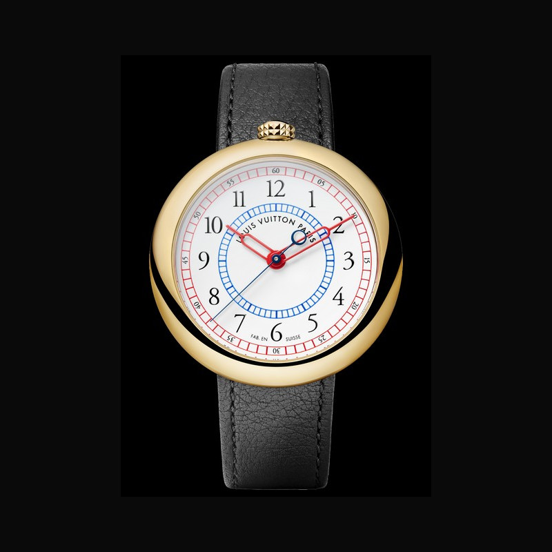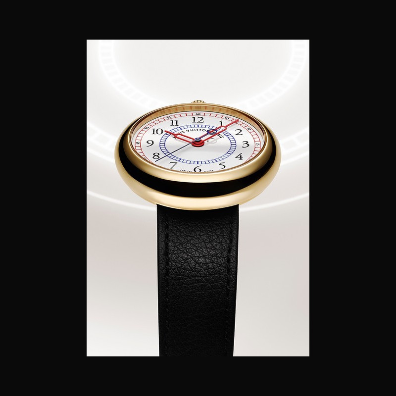 Avec son boîtier de 39mm en or jaune et en forme de galet, assorti d’un cadran blanc brillant en émail Grand Feu, la montre est animée par un mouvement automatique manufacture qui remplace le calibre à quartz d’origine. Résolument minimaliste, l’ADN graphique du modèle d’archives est préservé à travers les accents rouges et bleus des chemins de fer. En hommage aux créations de 1988, la Louis Vuitton Monterey est limitée à 188 exemplaires.
