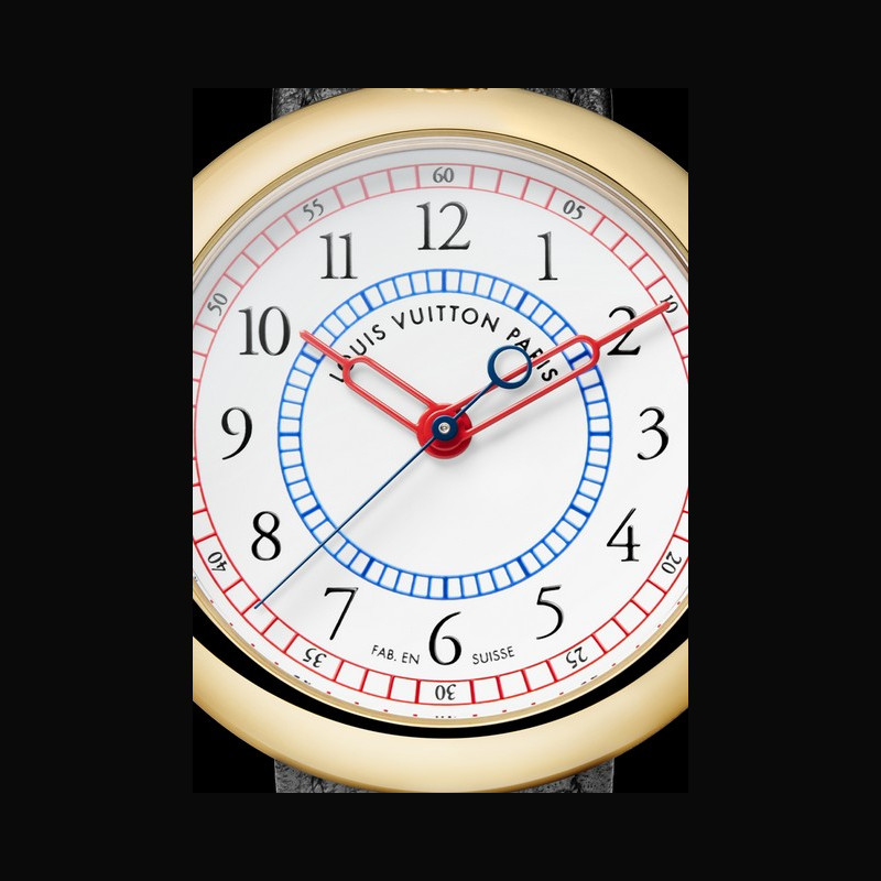 La tampographie peut alors commencer en mélangeant l’essence de poudre d’émail – bleue, rouge ou noire – pour former une pâte lisse, idéale pour le marquage de l’émail avec précision. Cette étape, qui permet d’élaborer la signature du cadran, dure deux heures. La machine doit être réglée minutieusement pour chaque couleur, à mesure que le motif, la nuance, la profondeur et le volume prennent forme. Au total, huit marquages sont nécessaires pour chacune des trois couleurs : quatre cuissons à 460 °C, suivies de quatre autres à 600 °C. Les teintes du cadran sont reprises dans les aiguilles en or blanc de la montre, à l’image du modèle original. Graphiques et contemporaines, les aiguilles en forme de seringue sont parées de laque rouge, et accompagnées d’une trotteuse en acier bleui. Les deux signatures « FAB. EN SUISSE» et « LOUIS VUITTON PARIS » viennent souligner l’ensemble.
