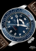 La Montre d’Aviateur Timezoner Édition « Le Petit Prince » (réf. IW395503) arbore un boîtier en acier inoxydable de 46 millimètres de diamètre, un cadran bleu nuit, une lunette tournante en céramique bleue portant les noms de 24 villes qui représentent les fuseaux horaires internationaux, ainsi que des chiffres et des aiguilles revêtus de matière luminescente blanche.