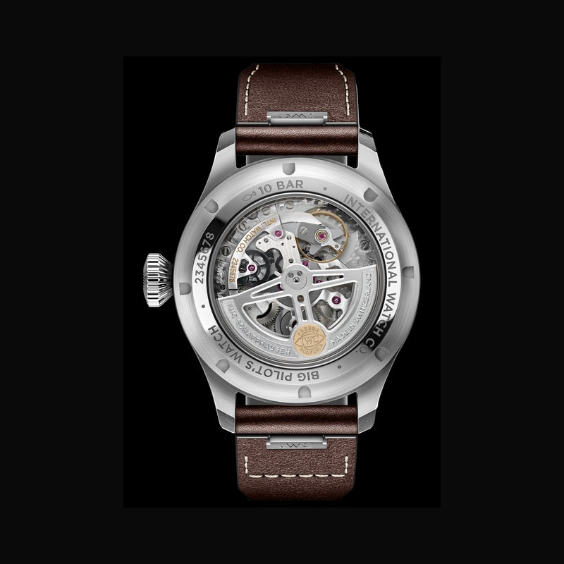 La Grande Montre d’Aviateur 43 est animée par le calibre 82100 de manufacture IWC. Ce mouvement automatique a été conçu pour offrir un niveau maximal de précision et de fiabilité. Il est équipé du système de remontage automatique extrêmement efficace développé par Albert Pellaton ; ce mécanisme utilise les plus petits mouvements du rotor – quelle que soit leur direction – afin de remonter le ressort-moteur. Ses composants, notamment la roue automatique et les cliquets de remontage connectés à celle-ci, sont en céramique d’oxyde de zirconium quasiment inusable. La fabrication d’aussi petites pièces en céramique représente un énorme défi d’ingénierie. Après remontage complet, le ressort- moteur emmagasine 60 heures de réserve de marche. Le mouvement, orné d’un méticuleux décor perlé, peut être observé à travers un fond en verre saphir.