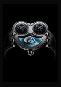 HM3 Frog: la Frog a été choisie comme plateforme pour la MOONMACHINE car son cadran, avec sa grande ouverture sur le mouvement, fournit à l'horloger un espace de jeu. De plus, les dômes imposants pour l'indication des heures et des minutes rappellent combien les mordus de science-fiction ont longtemps imaginé des habitations de même forme sur la lune. La différence entre la Frog et la HM3' Sur la première, les dômes en aluminium tournent sous les dômes en verre saphir, sur la seconde ce sont les aiguilles des heures et des minutes qui se déplacent autour de leur cône stationnaire respectif. Et cette HM3 Frog n'est pas ordinaire - c'est le moins que l'on puisse dire - car les dômes de la MOONMACHINE, uniques, sont perpendiculaires, et non plus parallèles, au poignet.