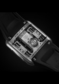 L’habillage, enfin, est au même niveau que le mouvement. Si la construction de la boîte est simple (deux pièces, carrure et fond en titane microbillé brillant), le verre saphir côté supérieur est le plus complexe jamais réalisé par Hublot, combinant des plans inclinés sur trois axes. Il en va de même pour le bracelet qui s’y intègre, en caoutchouc, également le plus perfectionné jamais dessiné par la Manufacture. Jusqu’à la future MP...