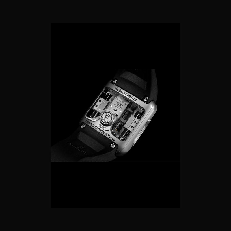 Pour que leur course ne vienne pas en heurter la butée, Hublot a développé un système d’amortissement des chocs. Ces deux masses verticales engrènent une crémaillère et sont capables de remonter le mouvement de manière bidirectionnelle – un développement 100% Hublot, également avec dépôt de brevet, et qui assure à la MP-10 une réserve de marche supérieure à 48 heures. Elle se remonte manuellement par la couronne à 12h, tandis que la mise à l’heure, pour ne pas entraver la fluidité du design, se fait par une seconde couronne nichée côté fond.