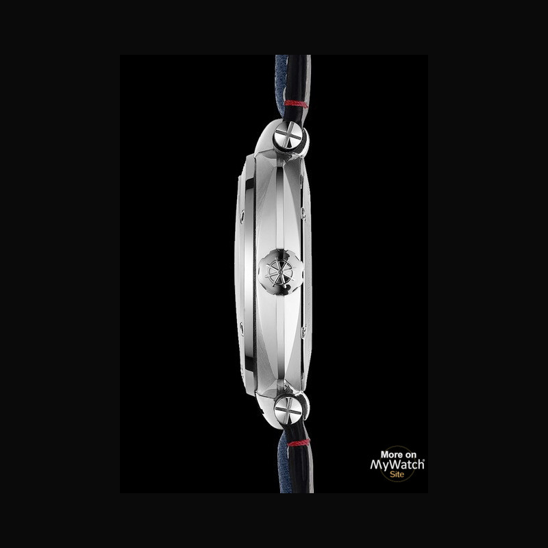 Subtilement mise en relief par des surfaces polies et brossées, la forme coussin du boîtier en acier inoxydable 316L (42 mm de diamètre) rehausse le cadran au fond bleu Newport soleillé. Très 70’s par sa grande ouverture Jour/Date à 3h, celui-ci n’est pas sans rappeler l’esthétique d’une boussole de navigation. Faisant écho aux quatre points cardinaux, un croisement de fines lignes perpendiculaires rouges orchestre les informations avec précision. Apposée sur le rehaut brossé circulaire, une minuterie clairement graduée rythme des index imposants facettés. De couleur acier et recouverts de matière luminescente blanche, ces derniers s’harmonisent aux aiguilles des heures et des minutes, animées par une trotteuse centrale rouge. Protégé par un verre saphir galbé double face, l’ensemble offre une lisibilité optimale accentuée par un jeu de contraste des couleurs.