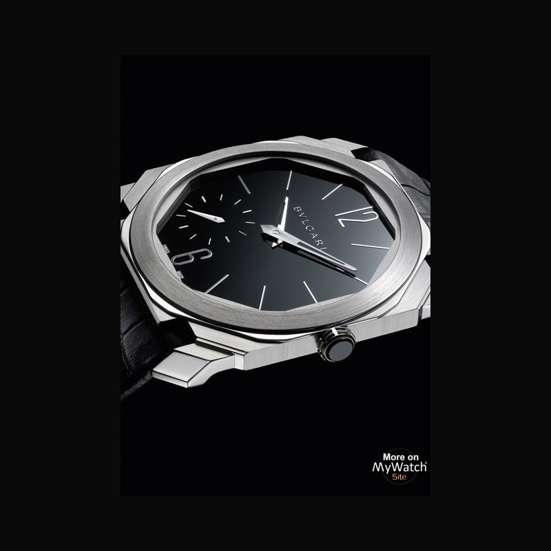 Habillée d’un boîtier en platine affichant un diamètre de 40 millimètres d’une épaisseur de 5.00 millimètres, offrant au regard une simplicité sereine renforcée par la pureté de son cadran noir de laque polie, Octo Finissimo se range dans la catégorie des montres classiques et élégantes affichant les heures et les minutes. La petite seconde est décentrée, à 7h30. Ce mouvement signale la réserve de marche, d’une durée de 70 heures environ, au dos de la montre.