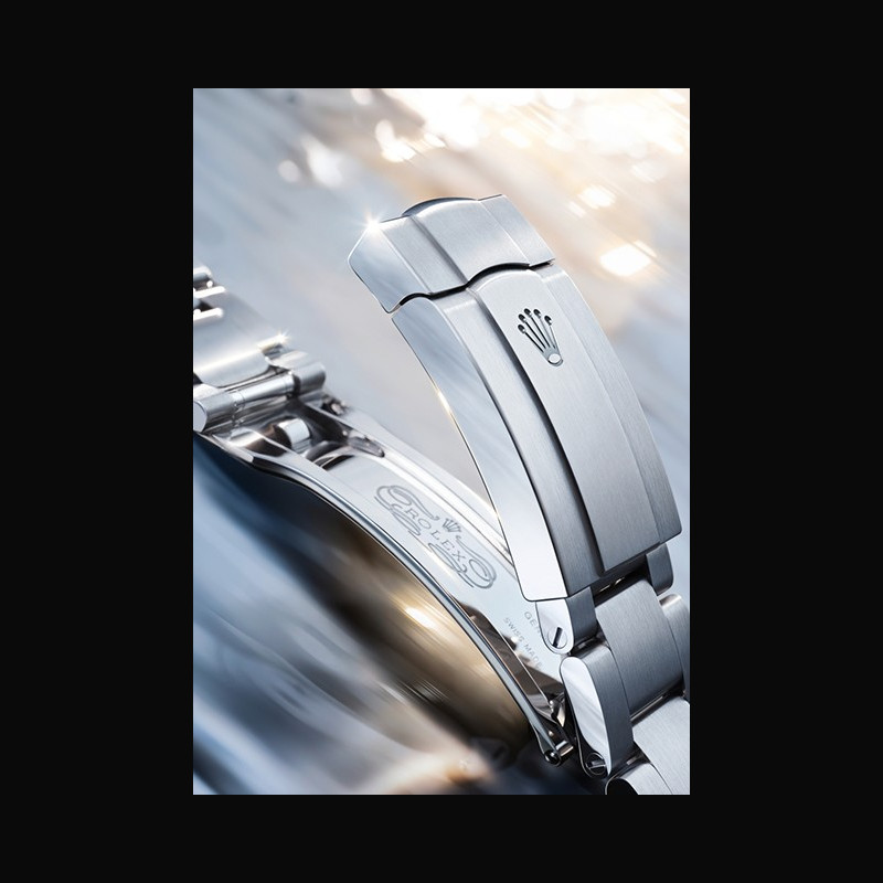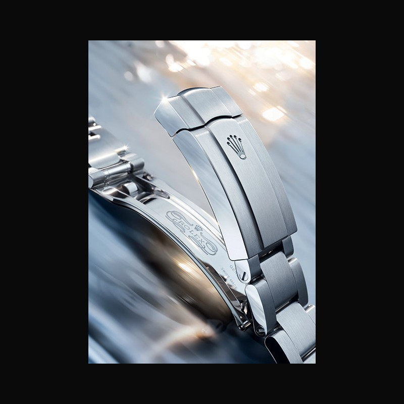 Sur ces montres, le bracelet Oyster est pourvu d’un fermoir Oysterclasp à boucle déployante. Il dispose de la rallonge rapide de confort Easylink, élaborée par Rolex, qui permet d’ajuster faci- lement sa longueur d’environ 5 mm. Sur les déclinaisons en or 18 ct, le bracelet Oyster intègre, autour des axes à l’intérieur de ses maillons, des inserts en céramique – conçus par Rolex et brevetés – qui contribuent à prévenir toute usure précoce et améliorent sa fluidité au porter.