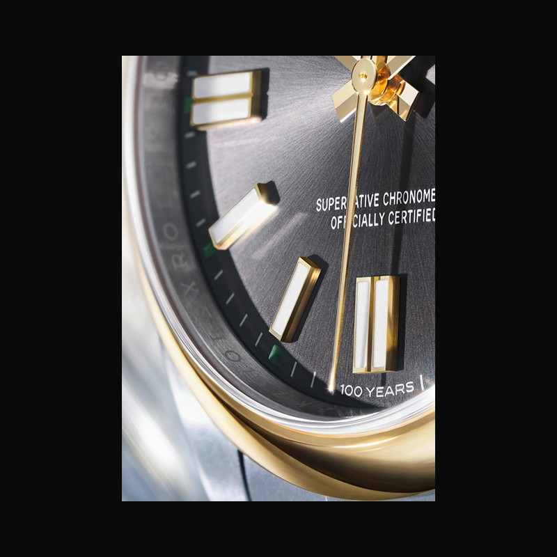 Cette montre comprend en outre plusieurs détails évoquant le centenaire de l’Oyster. La couronne de remontoir est ornée du nombre « 100 », qui apparaît en relief. Sur le cadran ardoise, la mention « 100 years» figure à 6 h, là où se situe habituellement l’inscription « Swiss Made». En outre, chaque intervalle de cinq minutes sur la minuterie est marqué par un carré vert et le nom « Rolex » est tampographié dans ce même vert, couleur emblé- matique de la marque.