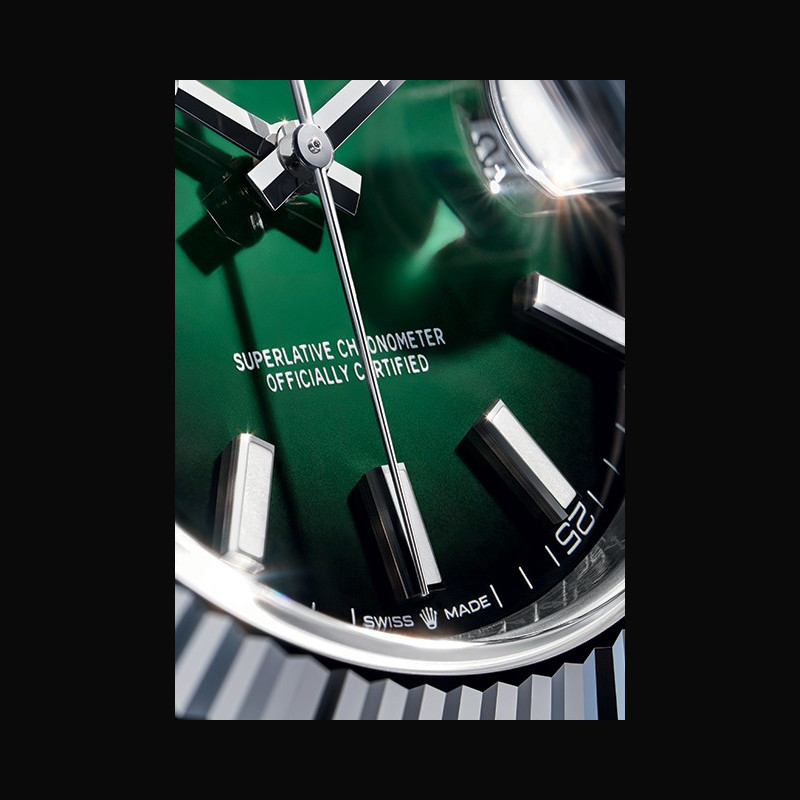 Le cadran laqué vert ombré, sur lequel les inscrip- tions de couleur blanche se démarquent de manière particulièrement visible, est orné d’index Chromalight. Sur la déclinaison présentée, il est accompagné d’une lunette cannelée et d’un bracelet Oyster avec fermoir Oysterclasp.