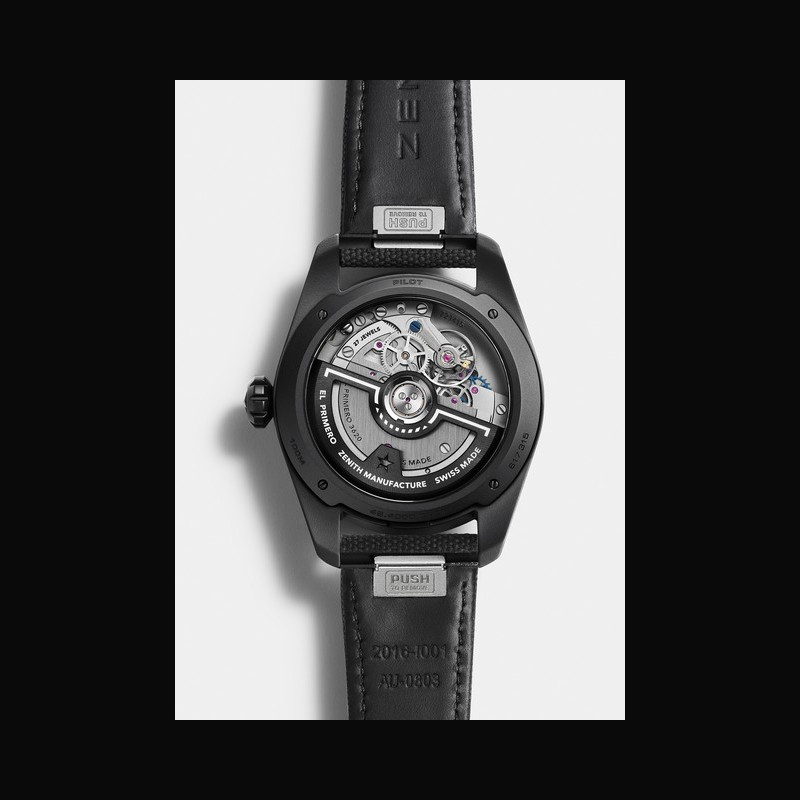 À travers le fond saphir de la Pilot Automatic, on peut admirer le mouvement de manufacture à haute fréquence El Primero 3620, doté d’une réserve de marche de 60 heures. La masse oscillante ajourée et noircie rappelle un « horizon artificiel », instrument de bord typique et essentiel qui donne au pilote l'inclinaison de l'avion par rapport à l'horizon terrestre.