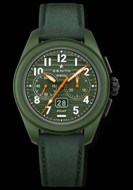 | Plus de caractéristiques : | Mouvement Grande Date à saut instantané en 0,007 sec., système de bracelets interchangeables, chronographe automatique El Primero avec roue à colonnes et fonction retour de vol. Grande date brevetée à 6 heures. Mouvement : El Primero 3652 Fréquence : 36’000 alt/h (5 Hz) Réserve de marche : environ. 60 heures Boitier Céramique khaki Cadran Khaki avec rainures horizontales Bracelet / Boucles Livrée avec deux bracelets : un en caoutchouc khaki à effet « Cordura » et boucle déployante en acier avec revêtement PVD noir ; et un autre un tissu nylon khaki de PORTER |